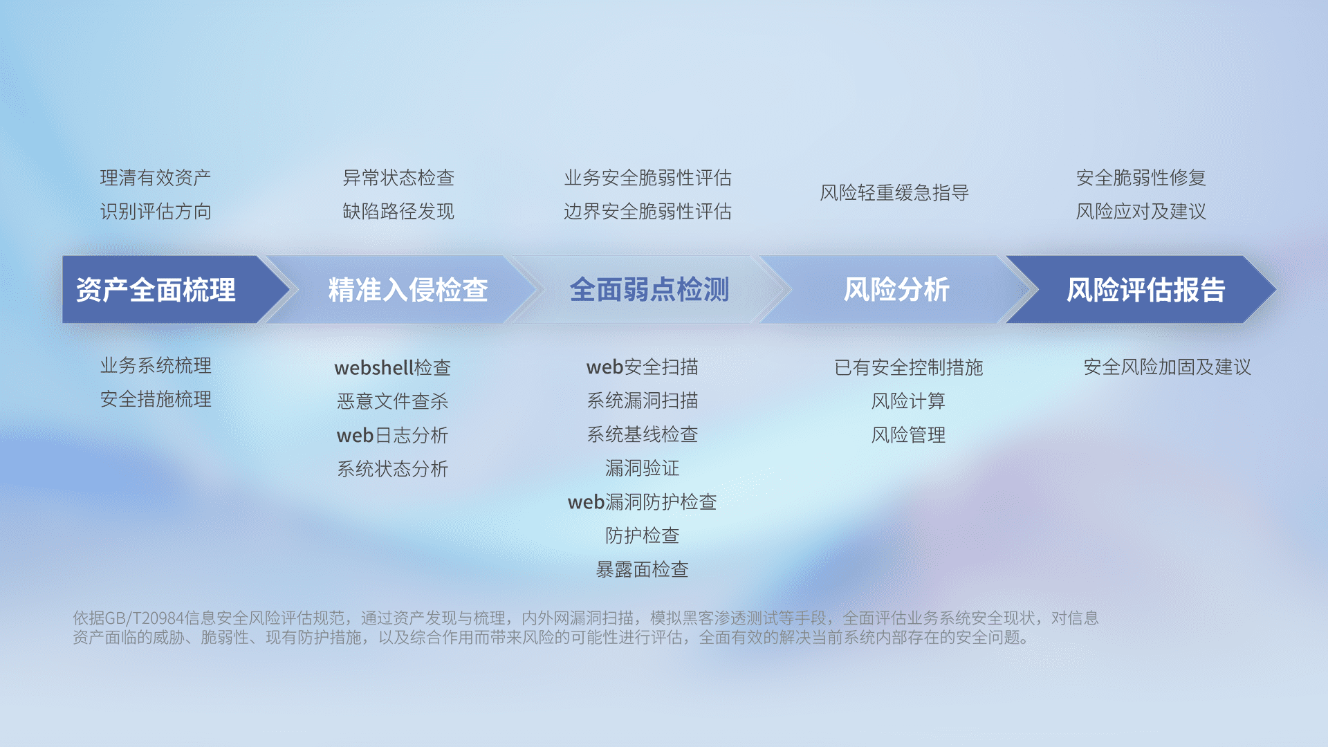 针对客户行业特性,,以专业的安全服务+多厂商联合解决方案提供专属的一站式安全管理服务,,,,帮助客户全面感知网络空间威胁,,,基于识别、、、检测、、分析、、、防护、、、监测、、、响应的服务理论模型,,,从方案咨询、、、集成交付、、、评估验证、、优化加固、、、运维运营,,,致力于为客户提供完整的闭环管理式安全服务。。。。以实战经验为客户打造高抵御风险的安全体系,,帮助客户发现威胁、、对抗威胁、、、处置威胁,,不断积累安全对抗能力,,,持续保障数字化安全。。。。